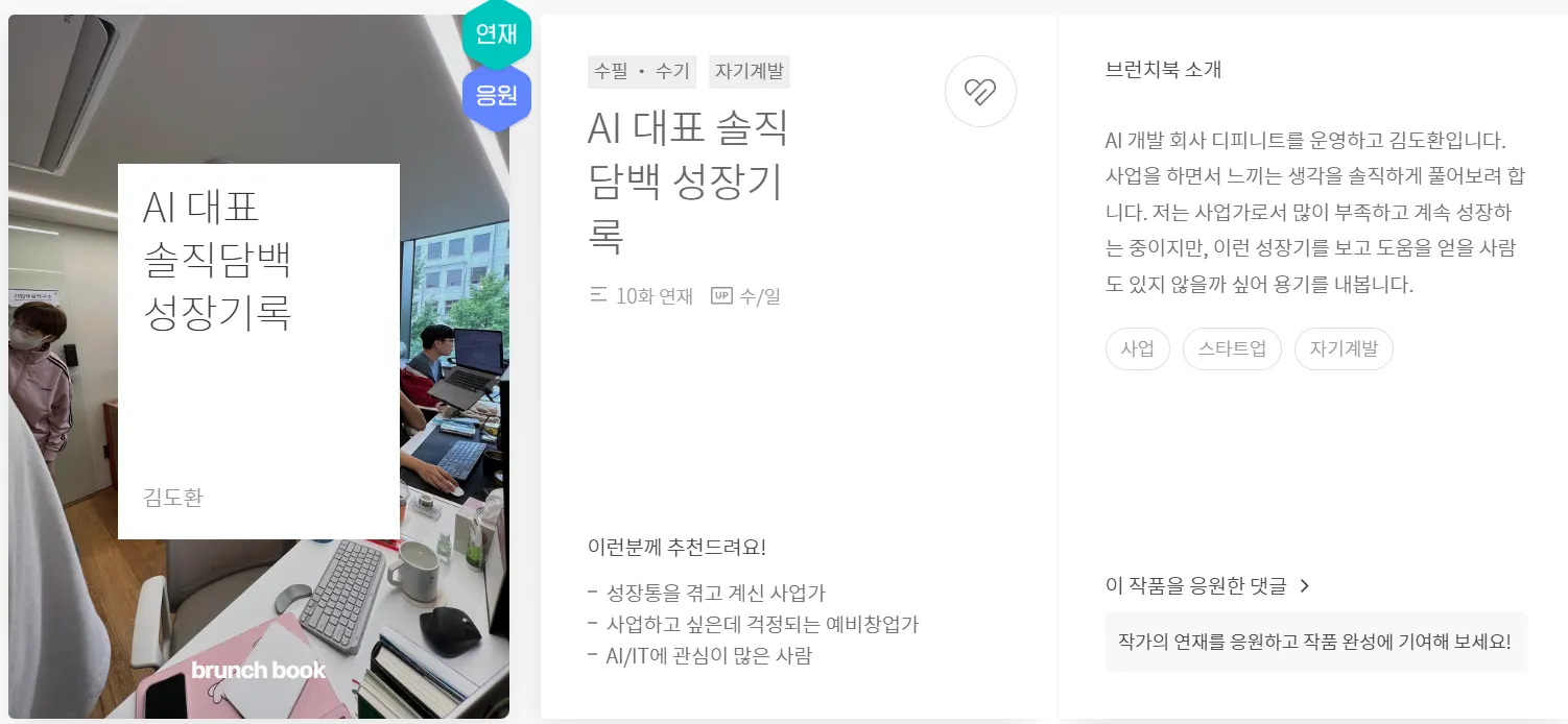 예를 들어, 가장 최근에 발행한 것은 ‘스타트업을 운영하면서 느꼈던 것’이라는 브런치 글인데요. 담백한 성장 기록 느낌으로 작성하고 있어요.