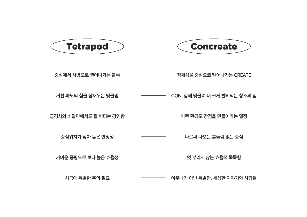 창조, 열정, 중심, 똑똑함 그리고 함께하는 사람들 마치 함께 모여 파도에 맞서는 단단한 테트라포드의 모습이 우리가 콘크리트에서 함께하는 모습과 같아 보였습니다. 나만의 콘텐츠를 하나씩 단단하게 쌓아가는 것 그것이 콘크리트가 가장 추구하는 모습입니다. 테트라포드는 그 모습을 보여줍니다.