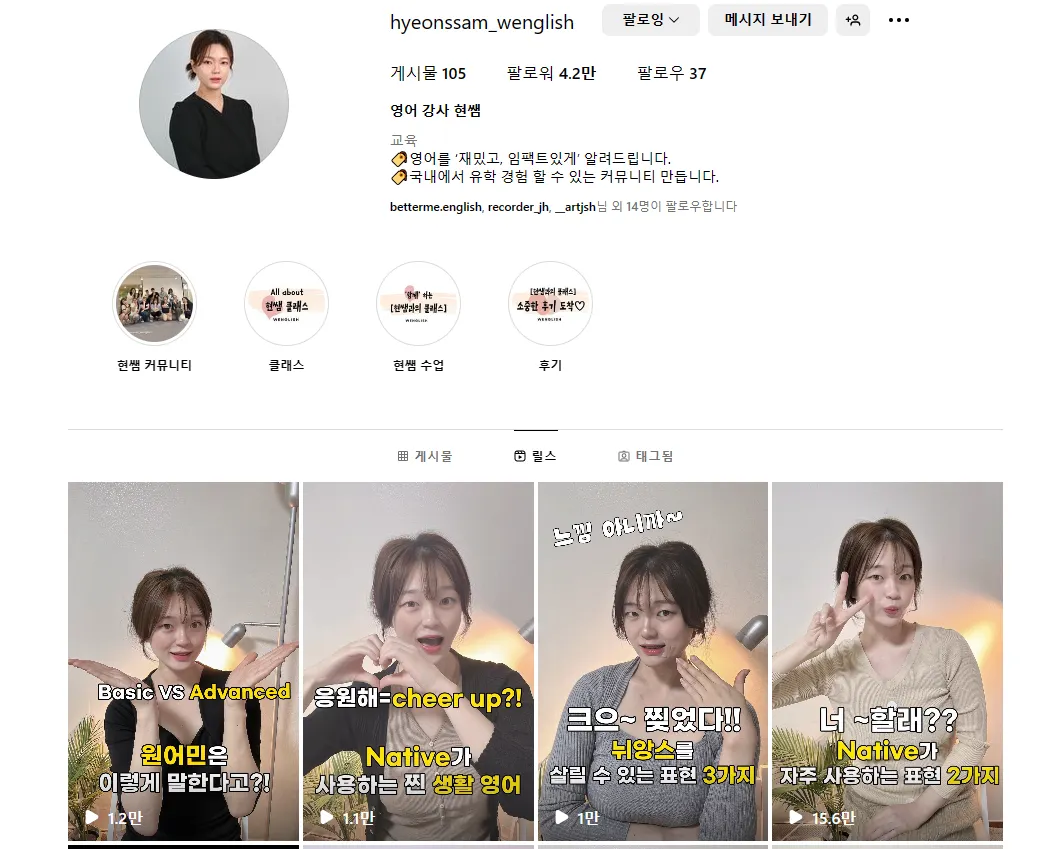 두 번째로, ‘유학파가 아니더라도 영어를 잘 할 수 있다’는 것을 저를 통해서 증명하고 싶었어요. 영어 스피킹은 즐거운 것이고, 한국에서도 충분히 재미있게 영어를 배워서 프리토킹을 할 수 있다는 걸 많은 분들께 알려드리고 싶었어요. 이 2가지 목적이 있어서 현쌤 계정이 크게 성장하지 않았나 싶어요. 현재는 원어민이 자주 사용하는 표현들을 많이 보여드리려고 하고 있어요.